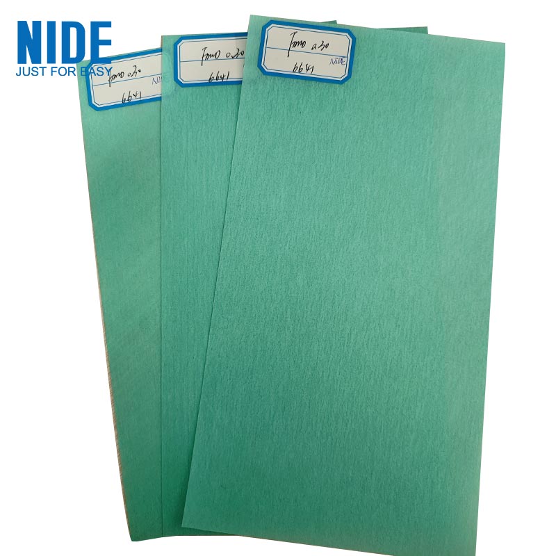 Awọn 6641 DMD apapọ ohun elo alapọpo mẹta ti o somọ nipasẹ resini ite F ni iwọn iwọn otutu resistance ti 155°C. O ti wa ni o kun lo fun Iho idabobo, Tan-si-Tan idabobo, gasiketi idabobo, transformer idabobo ti Y2 jara Motors tabi awọn miiran kekere-foliteji Motors. O tun le ṣee lo fun idabobo okun itanna F-kilasi.